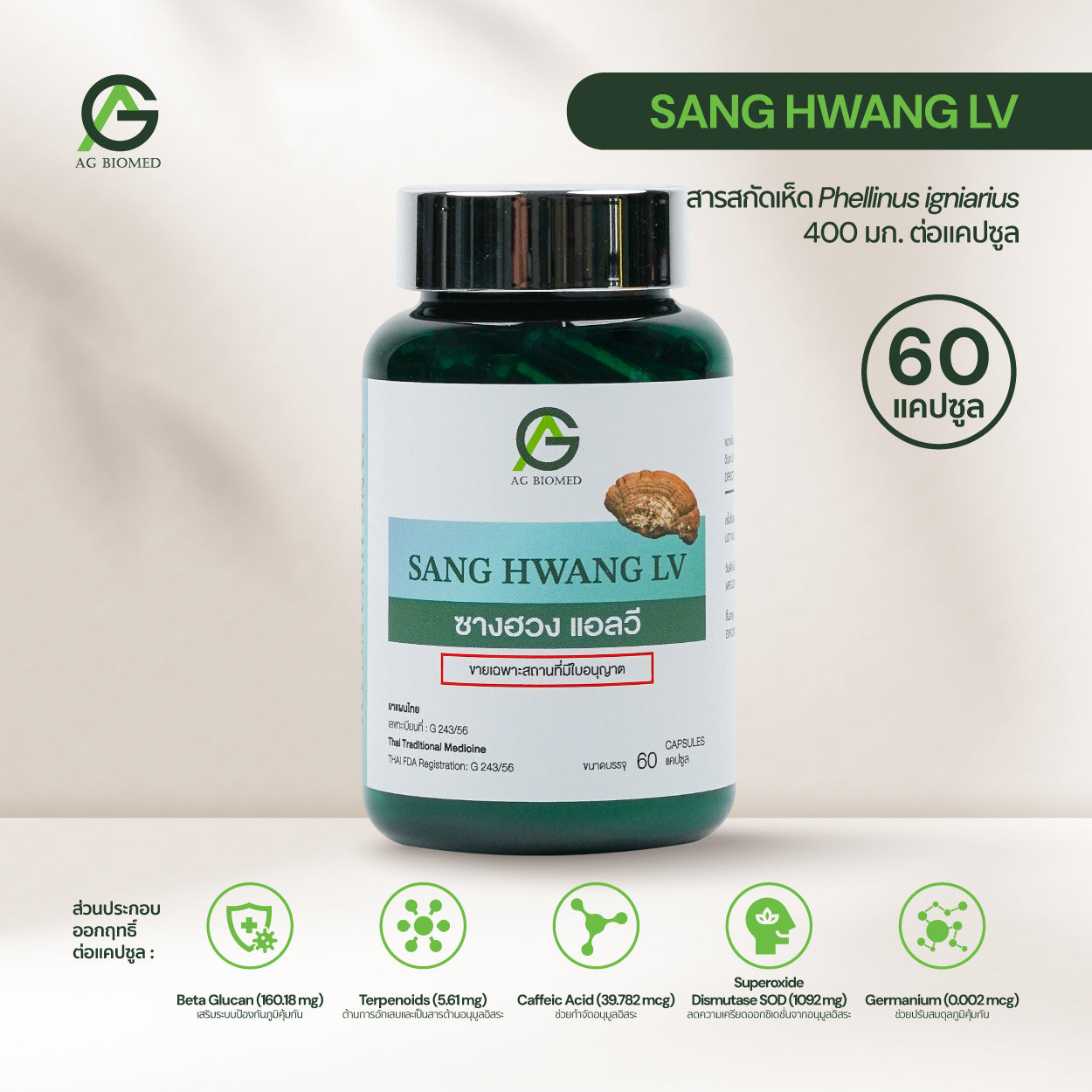 เห็ดซางฮวงธรรมชาติ Phellinus igniarius เป็นเห็ดสมุนไพรธรรมชาติ ที่ได้รับการวิจัยอย่างกว้างขวาง และเป็นที่รู้จักในด้านสารประกอบออกฤทธิ์ทางชีวภาพ ได้แก่ โพลีแซ็กคาไรด์ (เบต้ากลูแคนที่มีพันธะ 1-3/1-6) ไตรเทอร์พีนอยด์ และโพลีฟีนอล สารประกอบเหล่านี้พบว่าช่วยเสริมสร้างการทำงานของระบบภูมิคุ้มกัน ให้ประโยชน์ต่อต้านอนุมูลอิสระ ลดการอักเสบ และช่วยป้องกันและลดภาวะพังผืดในตับ